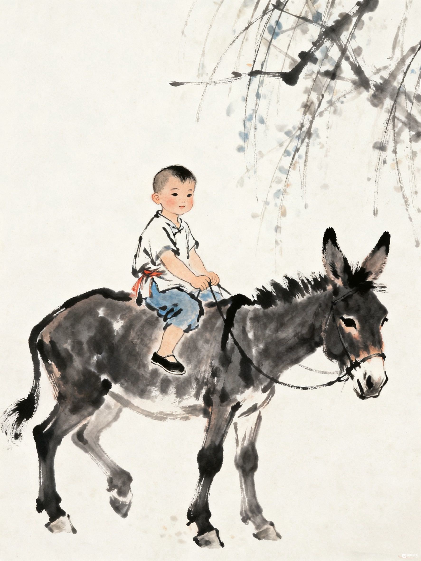 墨色的驴子稳稳走着,小娃坐在背上,手里攥着缰绳,眼睛亮得像藏了星 他的褂子干干净净,红腰带在蓝裤边儿上跳着色,小脚丫晃啊晃,却把驴子的毛摸得顺顺的。旁边柳枝用淡墨扫过,点点浅蓝像刚冒的芽,风一吹,仿佛能听见叶梢擦过空气的轻响。