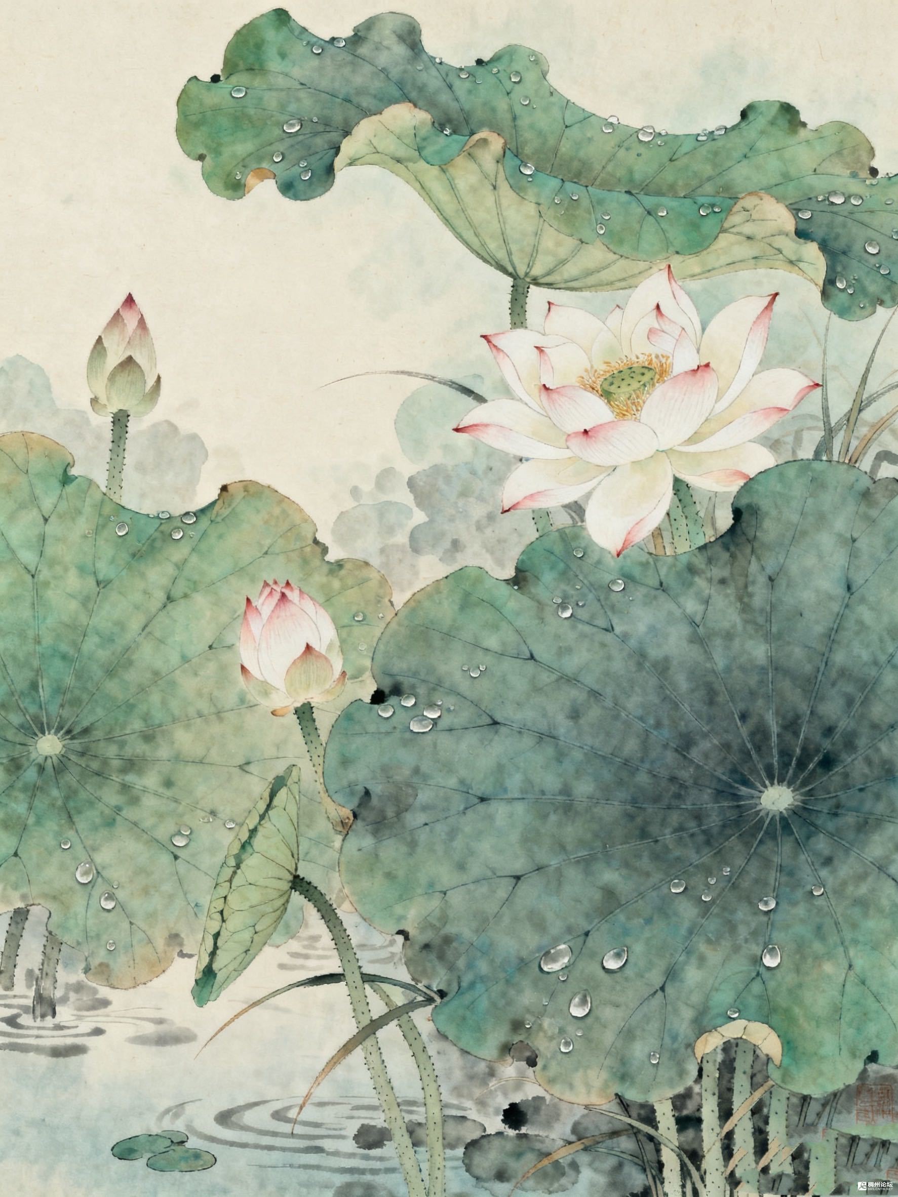 这画面里,荷的洁、叶的翠、水的柔,融成了幅雨后的清绝小景 水墨把荷叶的纹理、水珠的透亮都描得细腻,每片叶的卷舒、每朵花的姿态都透着“清水出芙蓉”的雅致。水面的涟漪淡淡晕开,把雨后荷塘的清新都锁在了纸里。