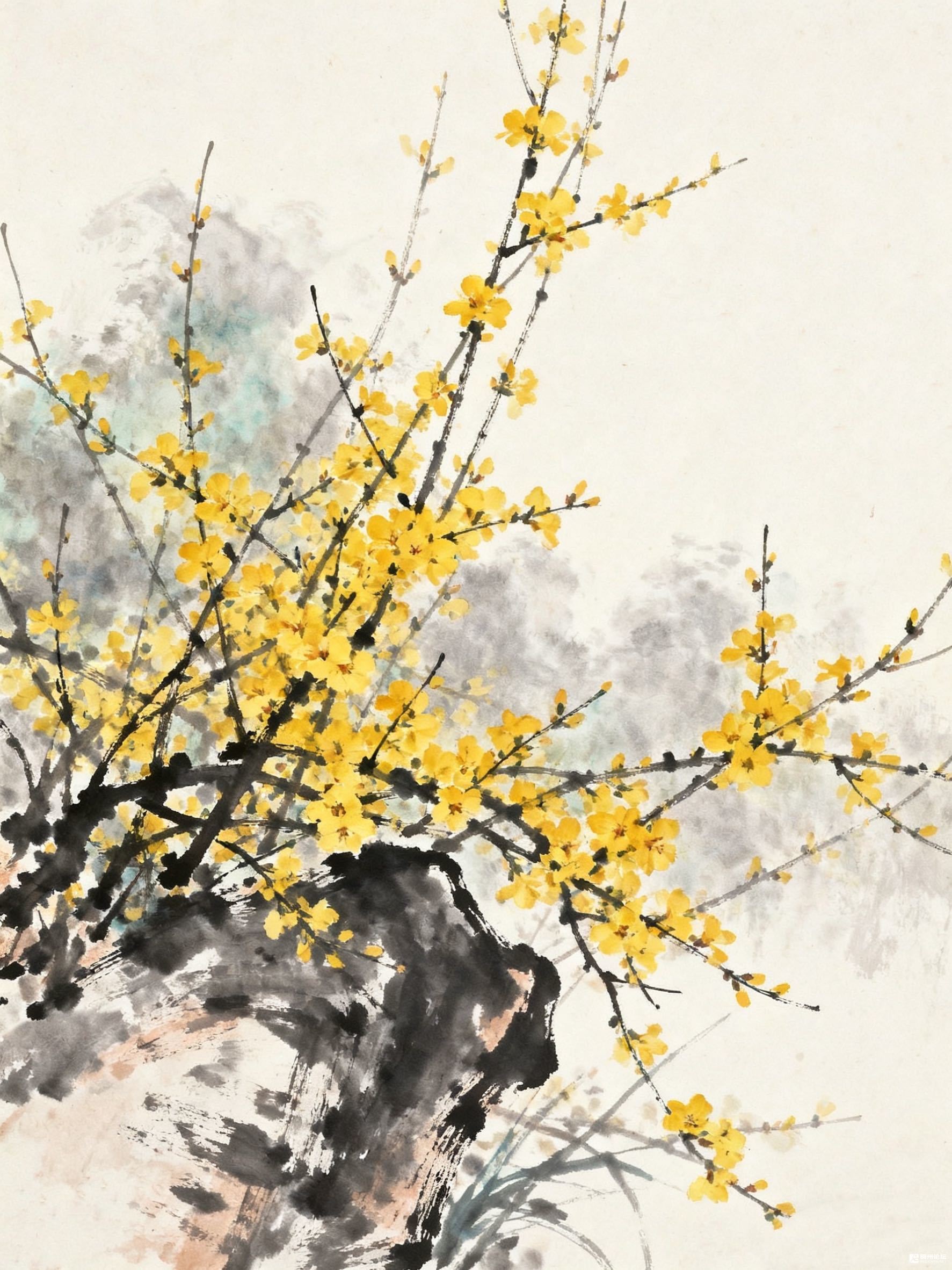 墨色的老枝上,腊梅炸开了满树金黄,像把阳光揉碎了,撒在寒枝上 花瓣薄薄的,却透着股执拗的亮,连空气里都像飘着清甜的香。旁边的石头用浓淡墨色晕染,粗粝的纹理里,倒衬得花枝更显娇俏。