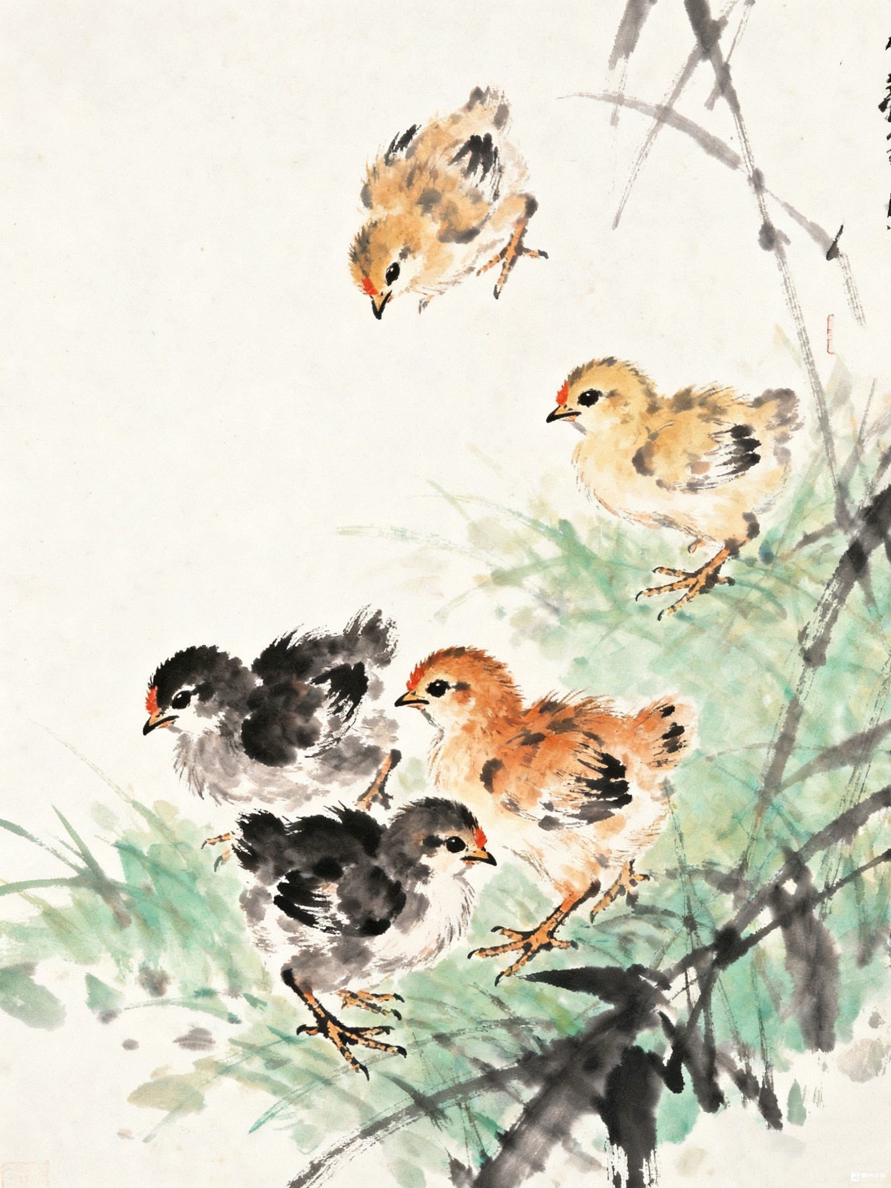水墨晕染的草色里,小鸡们的绒毛被画得软软糯糯,连头顶的小红点都透着娇憨。这画面里没有大鸡护着,只有小雏们自己探索的模样,莽撞又可爱,把春日的生机,都藏进了这几只小家伙的蹦跳里