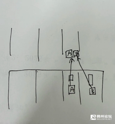 B车在A车后一点的位置等红绿灯,绿灯亮时A车先过路口,但B车突然加速,与A车发生剐蹭。