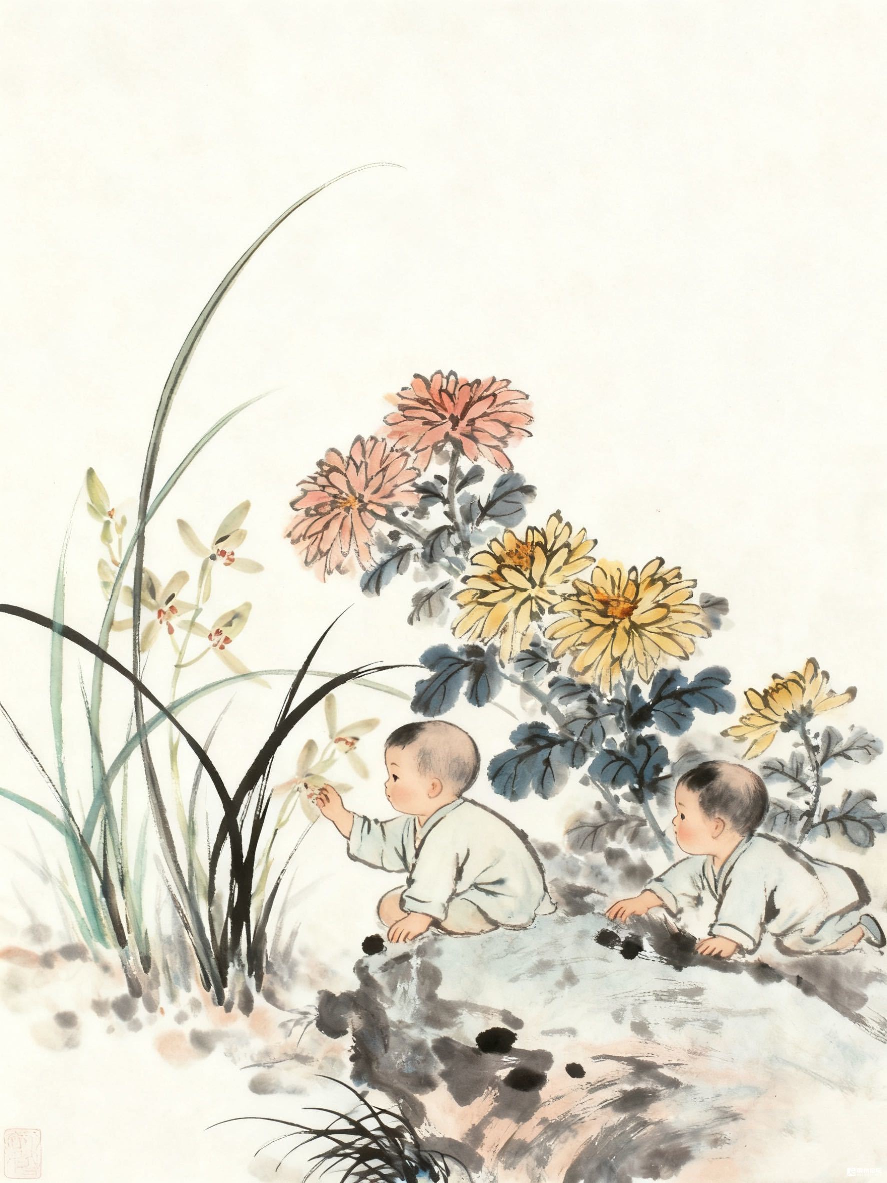 菊花开得正好,粉的像霞,黄的像金,叶子墨绿得能滴出水 俩光脑袋的小娃娃,穿着素白的衣裳,在石头上爬着、探着。前头的娃伸手去碰兰草的花,指尖轻轻悬着,像怕惊落了那点嫩黄;后头的娃也支着小手,眼睛直勾勾盯着,小模样又好奇又小心。