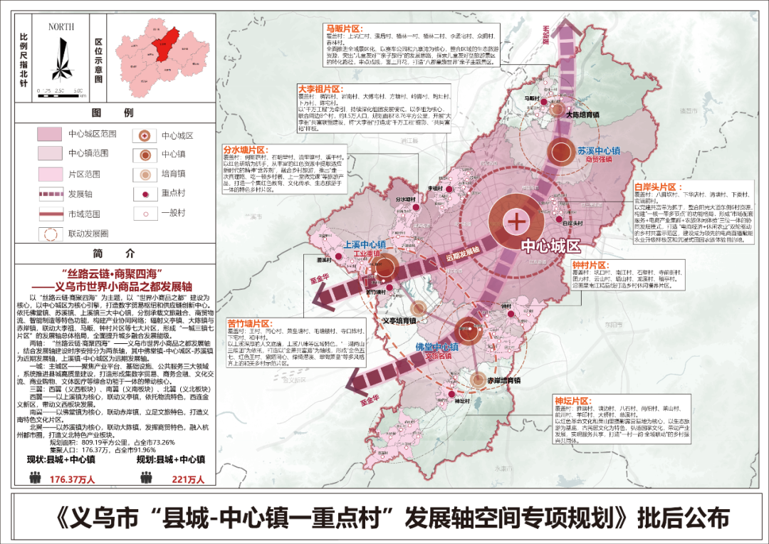 根据《关于以“千万工程”牵引城乡融合发展缩小“三大差距”推进共同富裕先行示范的实施方案》(浙委发〔2025〕1号)等文件精神,我市已组织编制完成《义乌市“县城—中心镇—重点村”发展轴空间专项规划(2025—2035年)》,于2025年9月30日经义乌市人民政府批复同意,根据有关法律要求,现将规划主要内容公布如下: