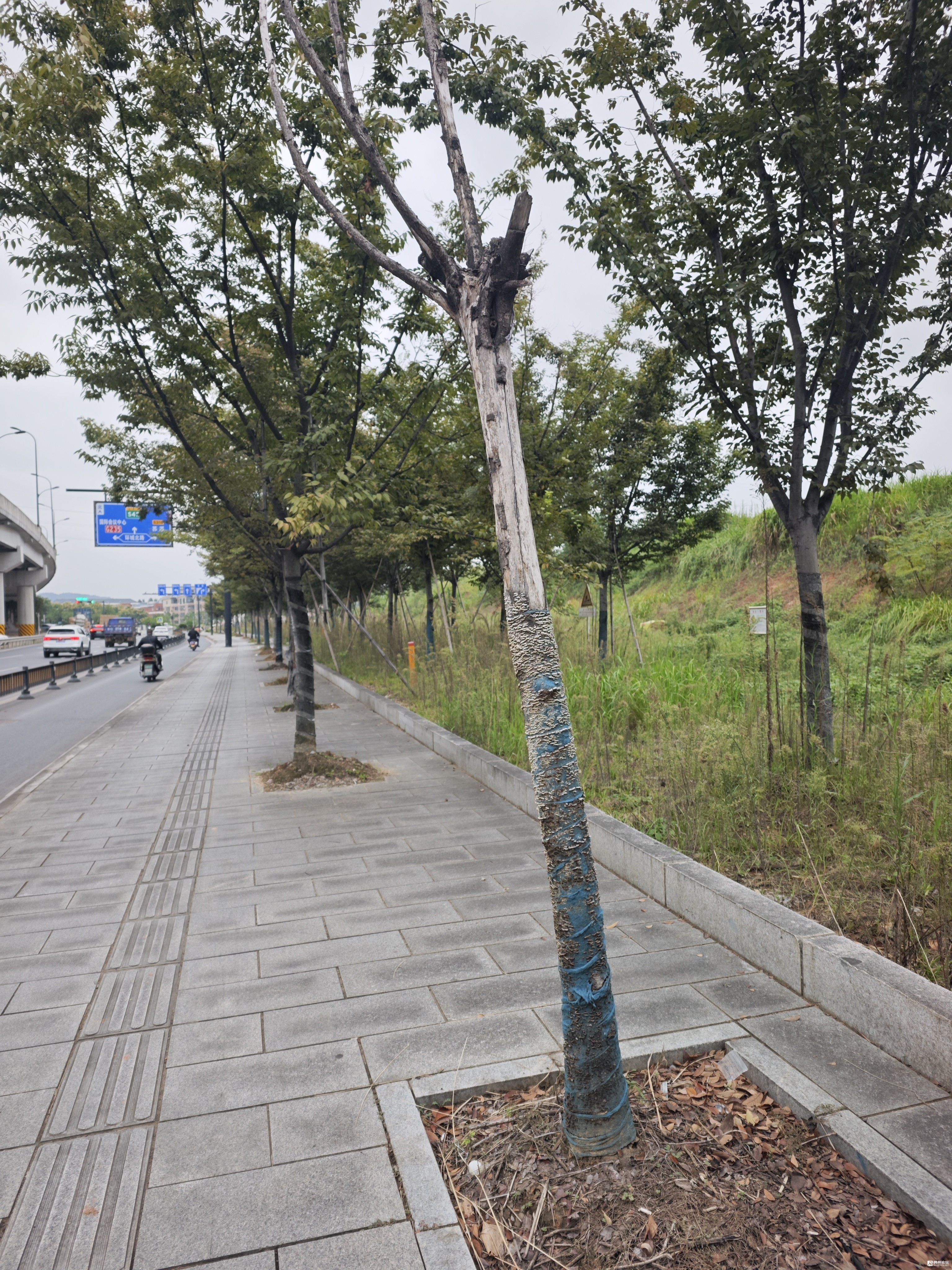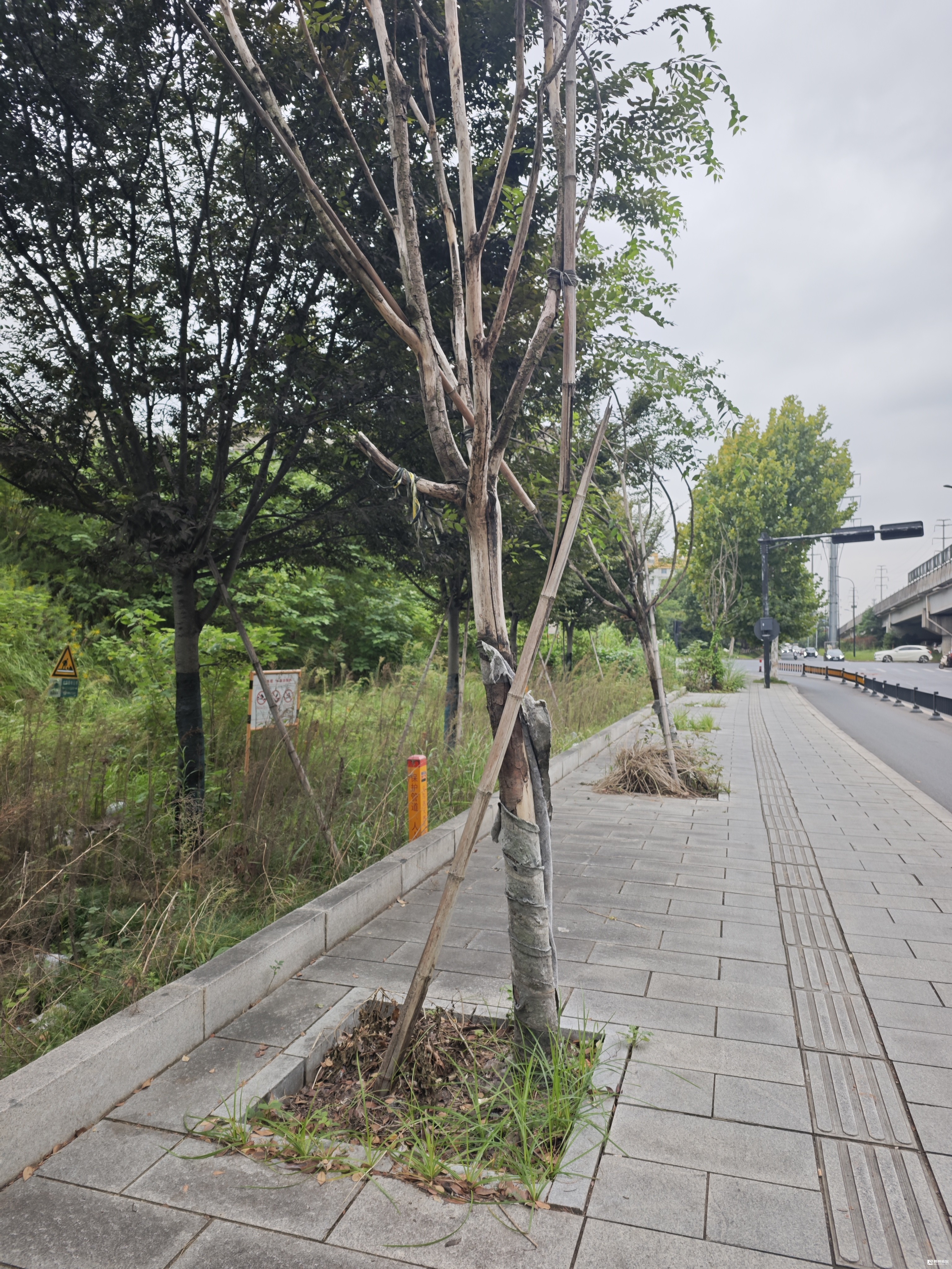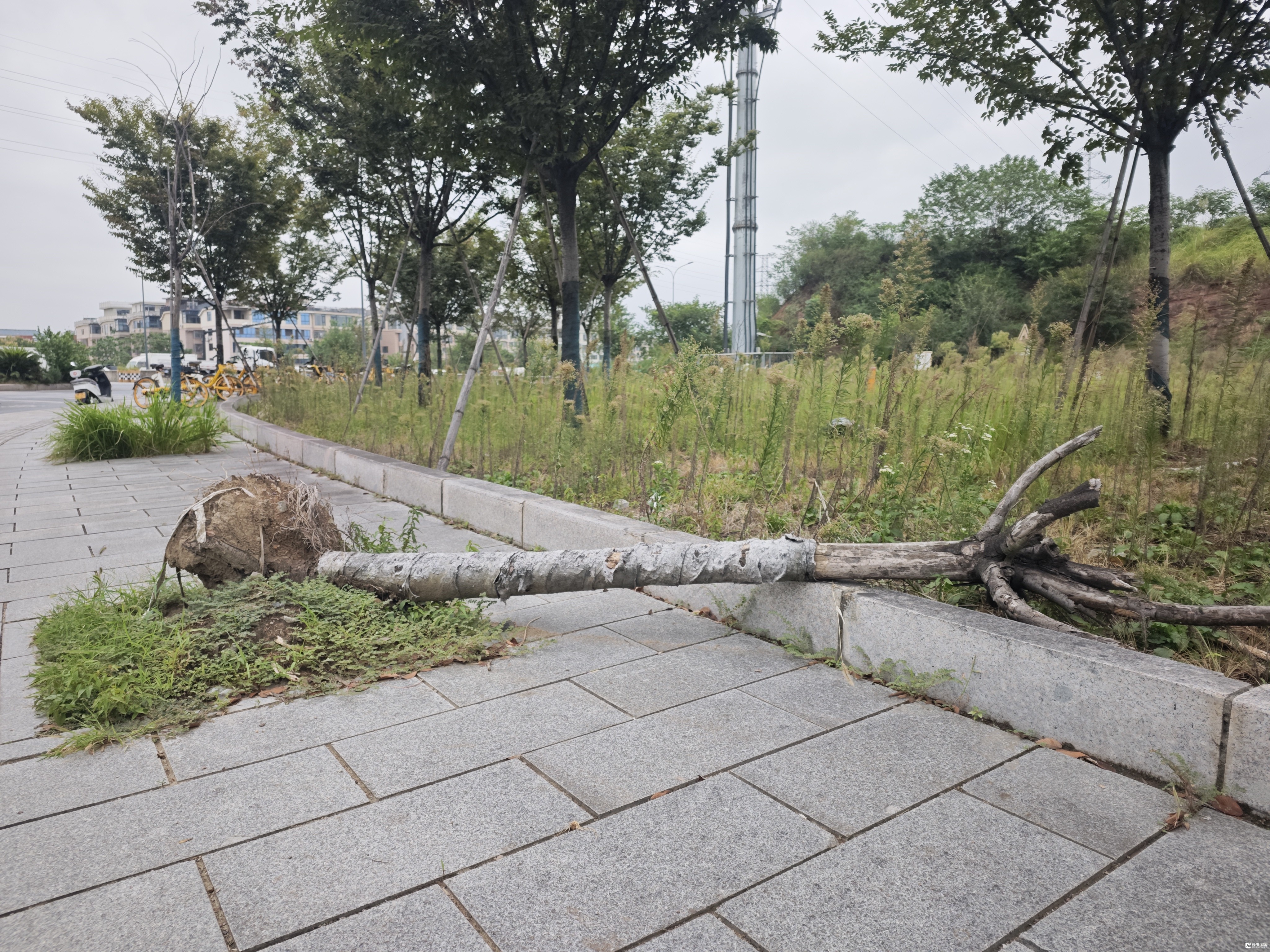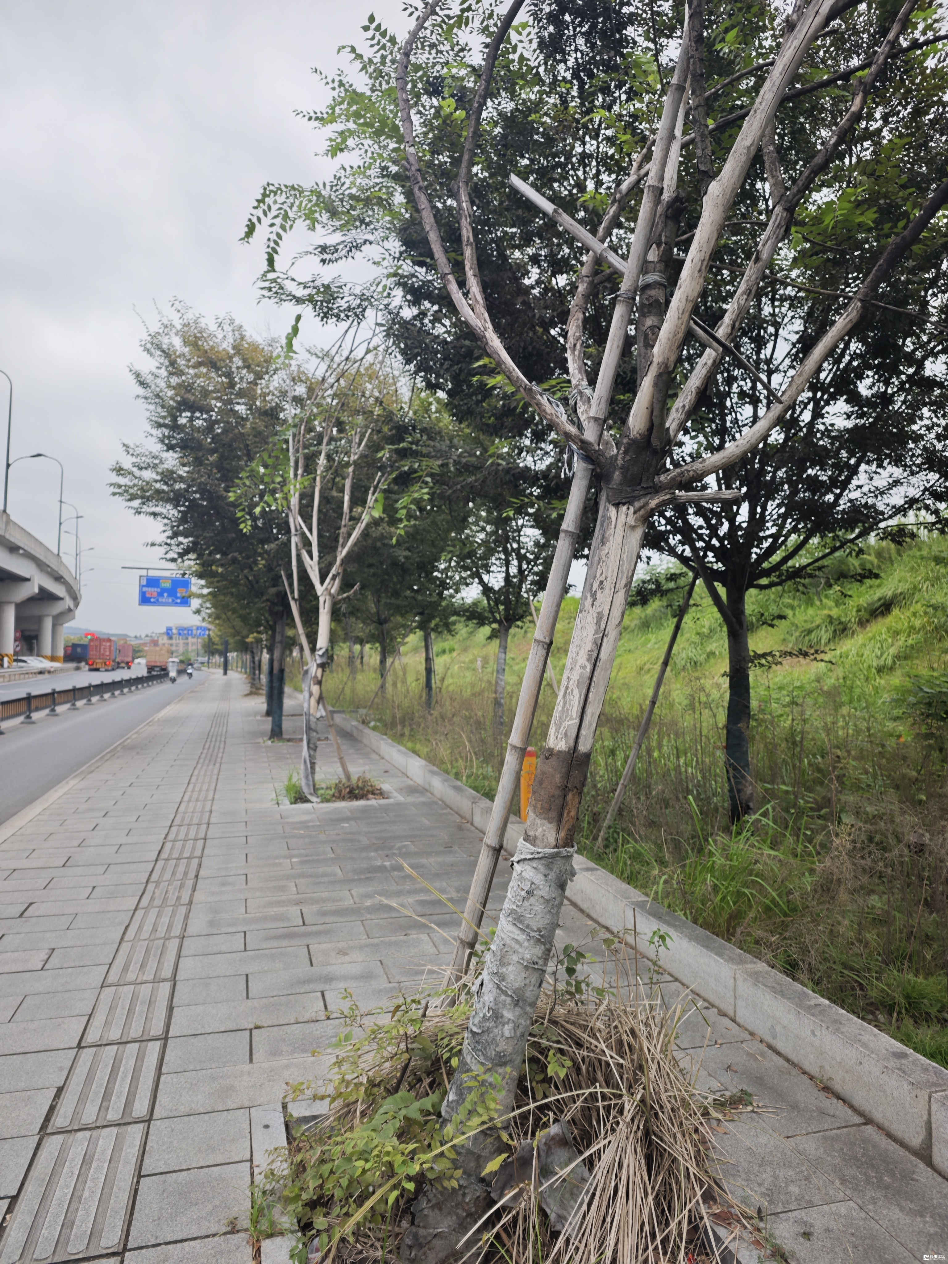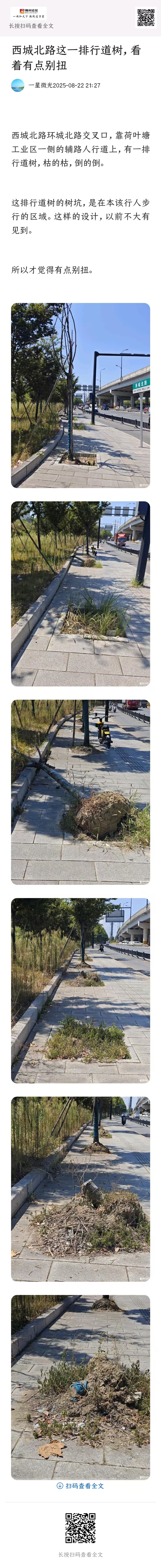 位于西城北路环城北路交叉口,靠近荷叶塘工业区一侧的那排行道树,有的倒地,有的枯死,也有的留了个树坑,真正成活的没几株。