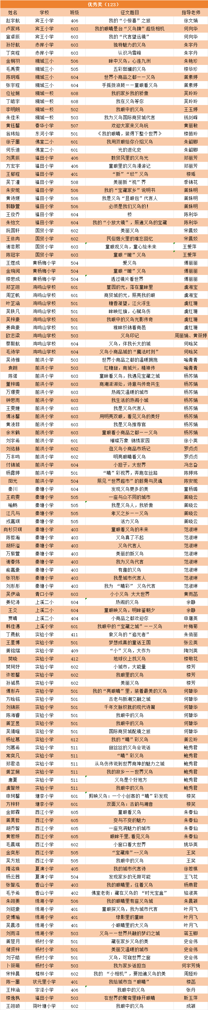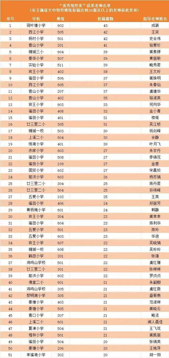 在征文评选阶段,评委团专家成员开展了几轮严格的评审,综合考虑投稿数量、征文质量和学校均衡性等各方因素,正式评出321篇获奖作文,获奖比例占总投稿数的15%左右,其中1-3年级段一等奖8名,二等奖15名,三等奖35名,优秀奖55名;评出4-6年级段一等奖10名,二等奖25名,三等奖50名,优秀奖123名。同时评出班级投稿优秀组织奖老师51名。现将评选结果公布如下: