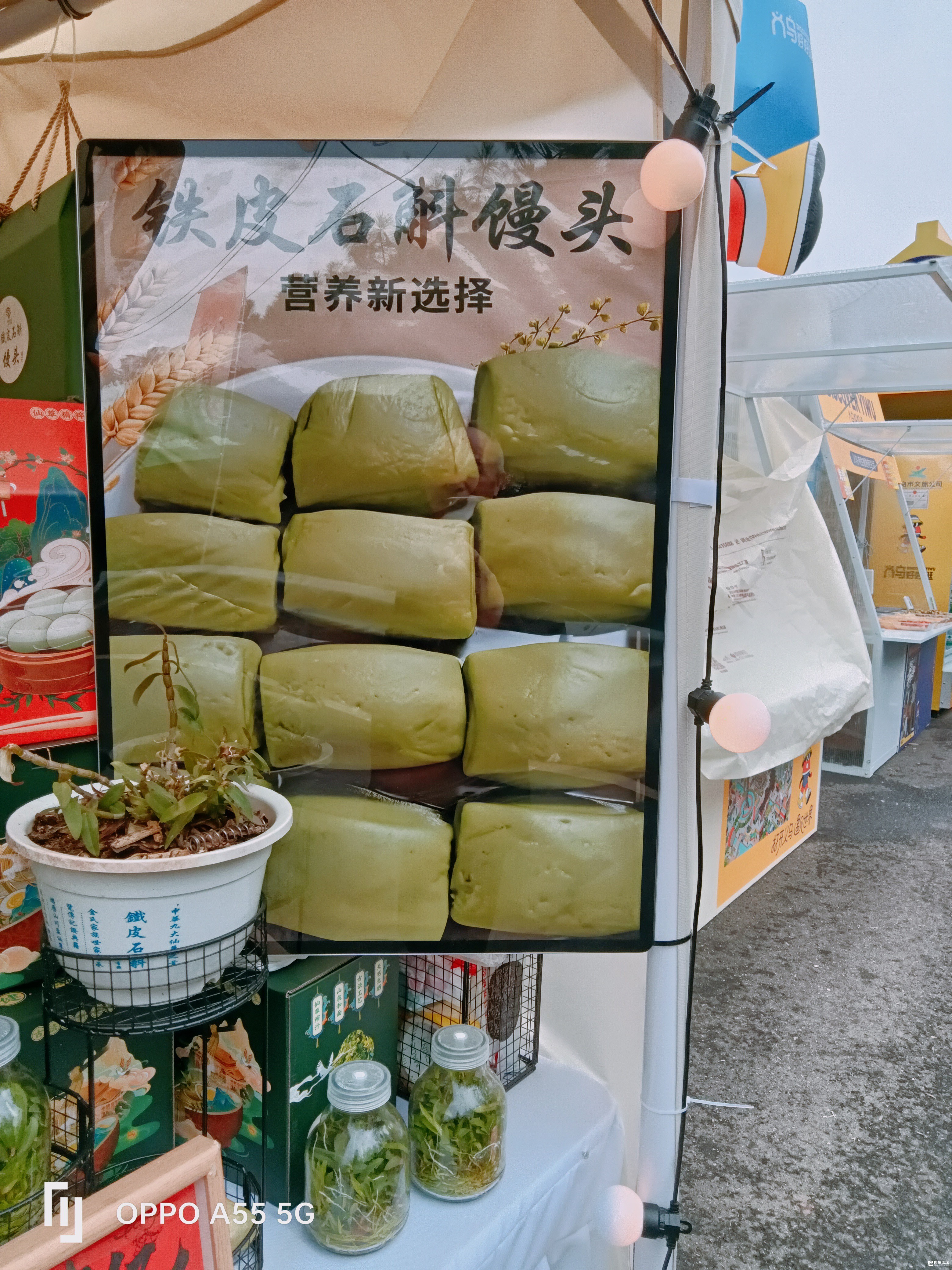 义亭重阳节的铜山岩山麓下,靠山边,一长溜美食市集小摊,其中最有创意的东西是“铁皮石斛营养面包”,5元一个。6个一小包,合30元。有人说,5元一个价格有点高,有人认为,铁皮石斛是仙草,营养好,5元一个也值得……