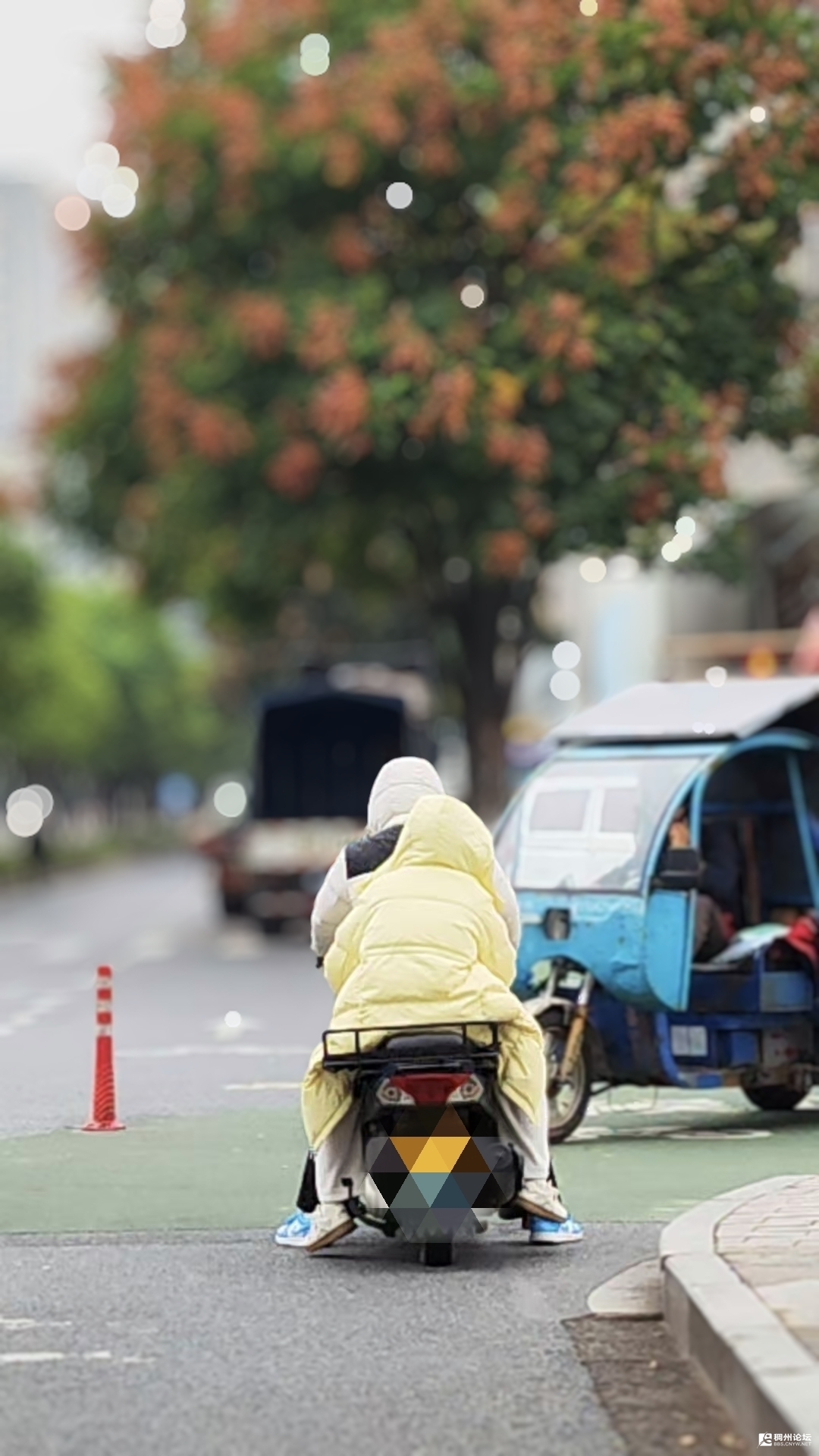 当前气温15.1 °C,马路上骑乘电动车的一对男女,已经穿上了羽绒服。