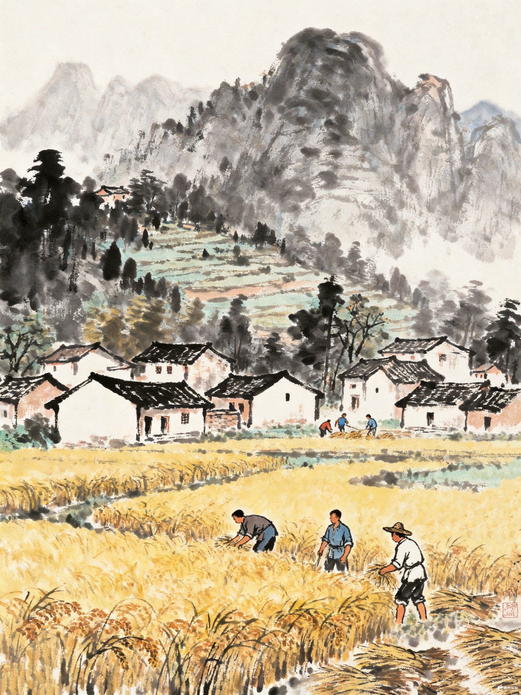 远山像蒙着层淡墨的纱,山脚下的村庄白墙黑瓦,安安静静卧在金黄的稻浪边 田里的人弯着腰,手里的镰刀划过稻穗,“唰唰”声像在给秋天伴奏。阳光把稻子晒得发亮,连空气里都飘着谷物的香。