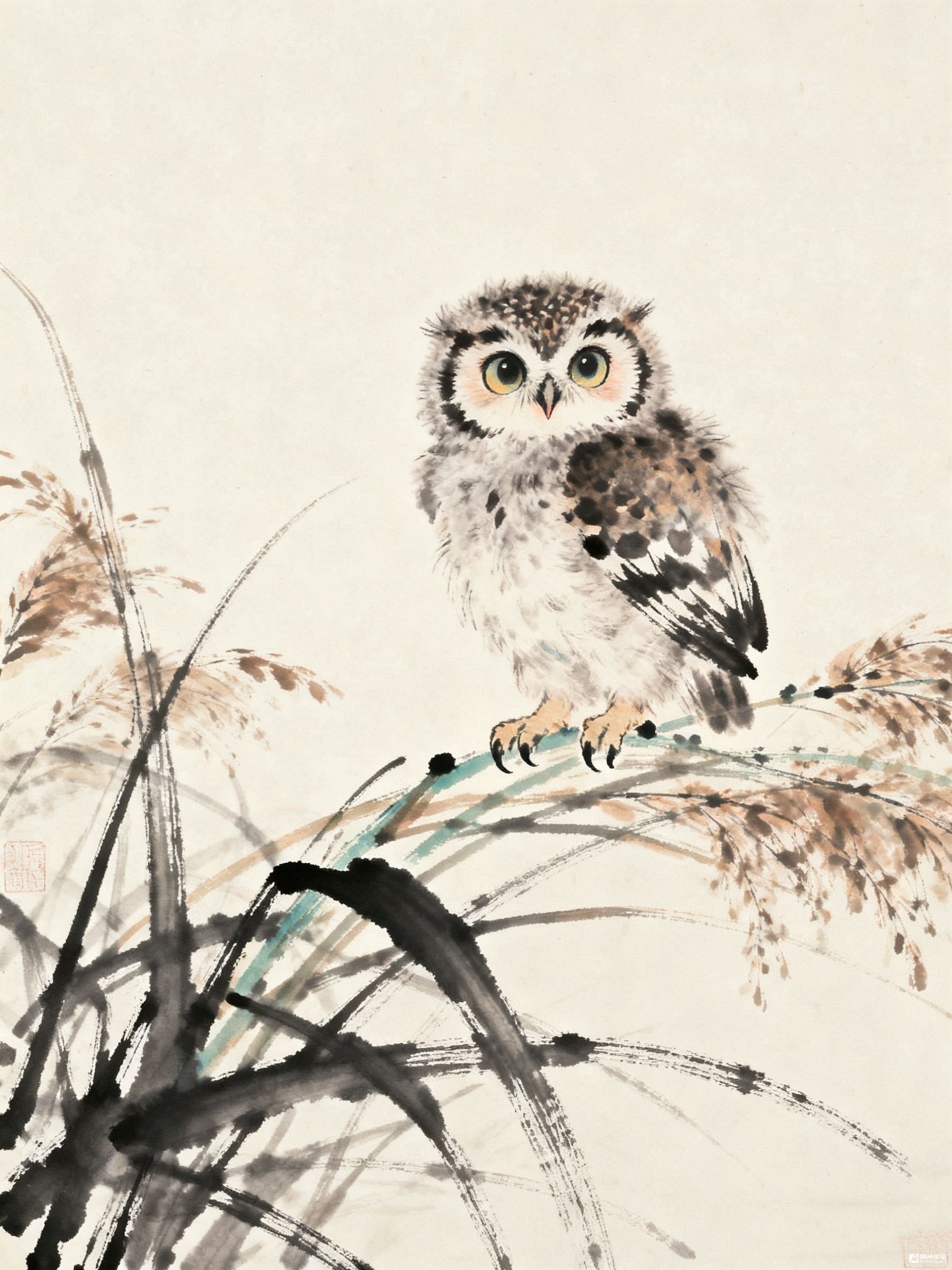 旁边的苇叶用浓淡墨色勾勒,有的挺拔,有的弯折,风过的痕迹都藏在笔锋里。背景素净得像张宣纸,把小猫头鹰衬得愈发鲜活——没有多余的色彩,却把小家伙的灵动、苇丛的野趣,都描得恰到好处 忽然觉得,自然里的小生命,哪怕只是只安静待着的猫头鹰,都藏着让人心软的可爱。