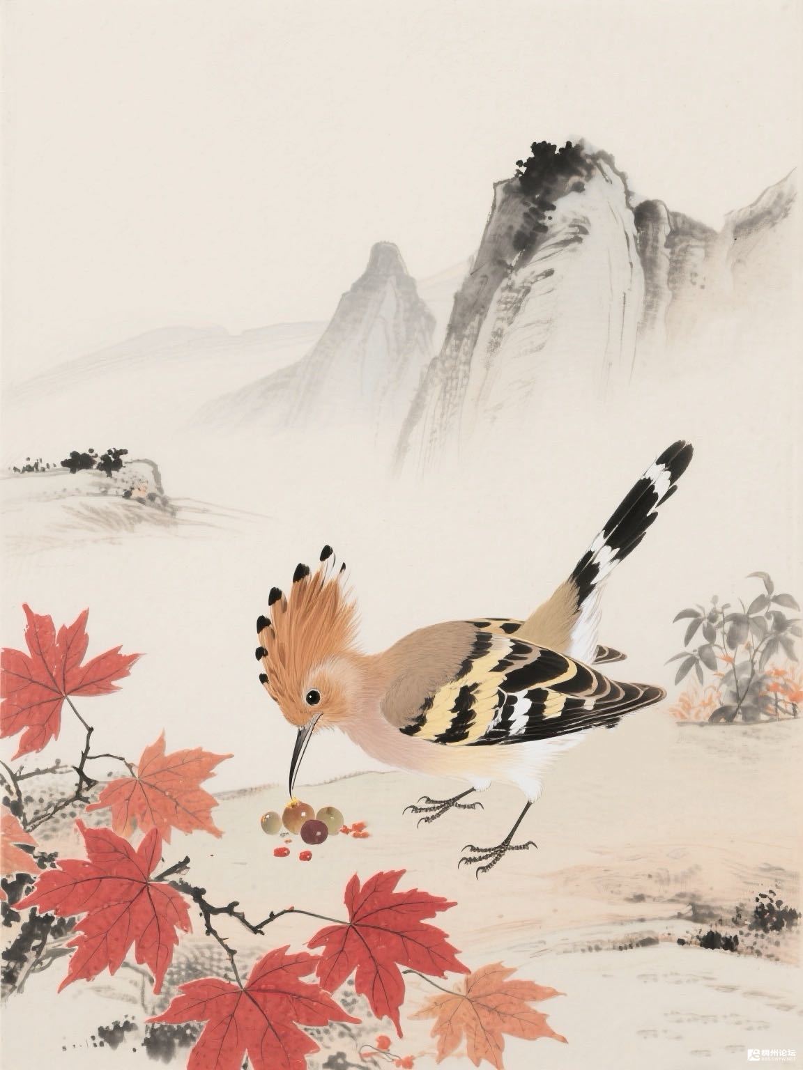 红枫像团火,在浅墨的山间烧得正旺 戴胜鸟顶着棕黄的羽冠,低头啄着地上的小果子,翅膀上黑黄相间的斑纹,在素色背景里格外鲜亮。远处的山晕成淡淡的影,像披了层薄纱,把天地衬得愈发清透。