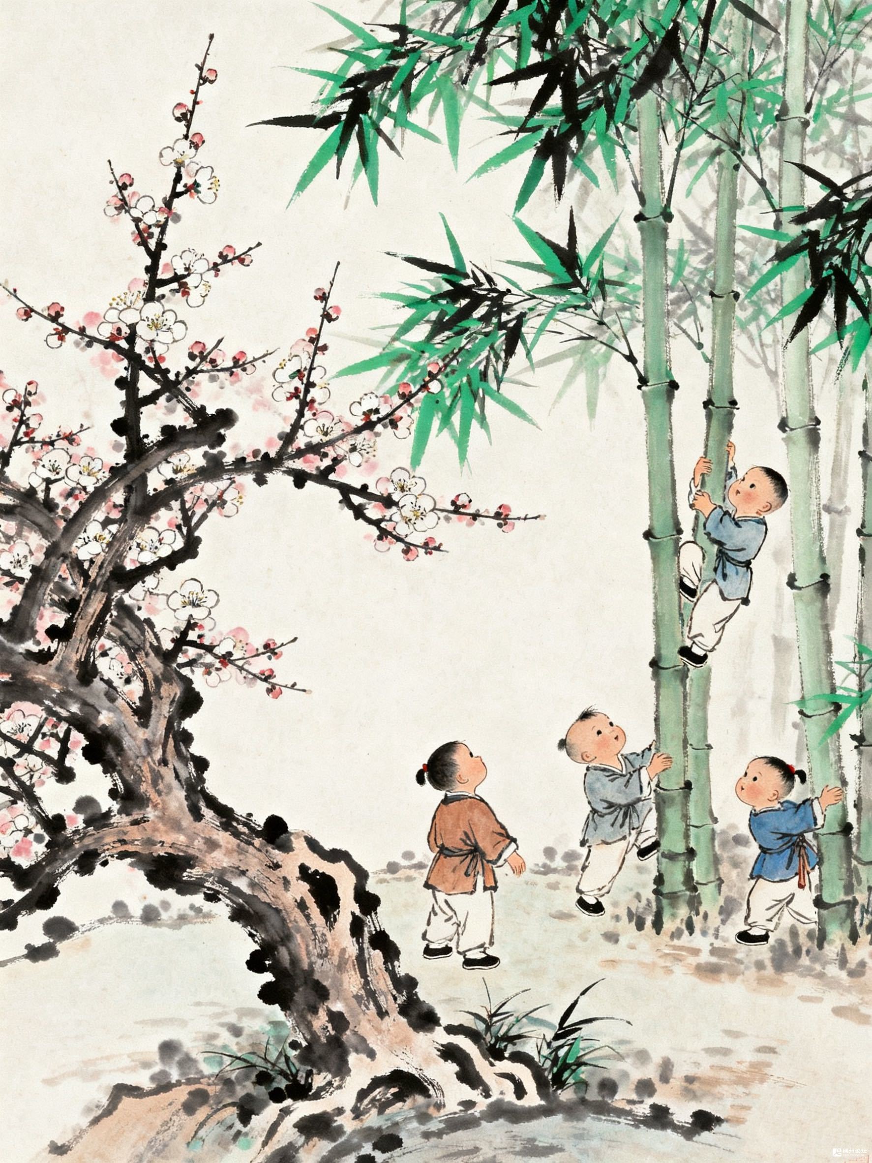 白梅开得如云似雪,老枝虬曲苍劲,旁边的修竹绿得发亮,节节挺拔 几个小娃在竹林里闹着:一个正往竹杆上爬,小脚丫蹬得紧紧的;几个在底下仰着头,有的伸手够竹节,有的盯着爬高的伙伴,小脸蛋上满是兴奋。